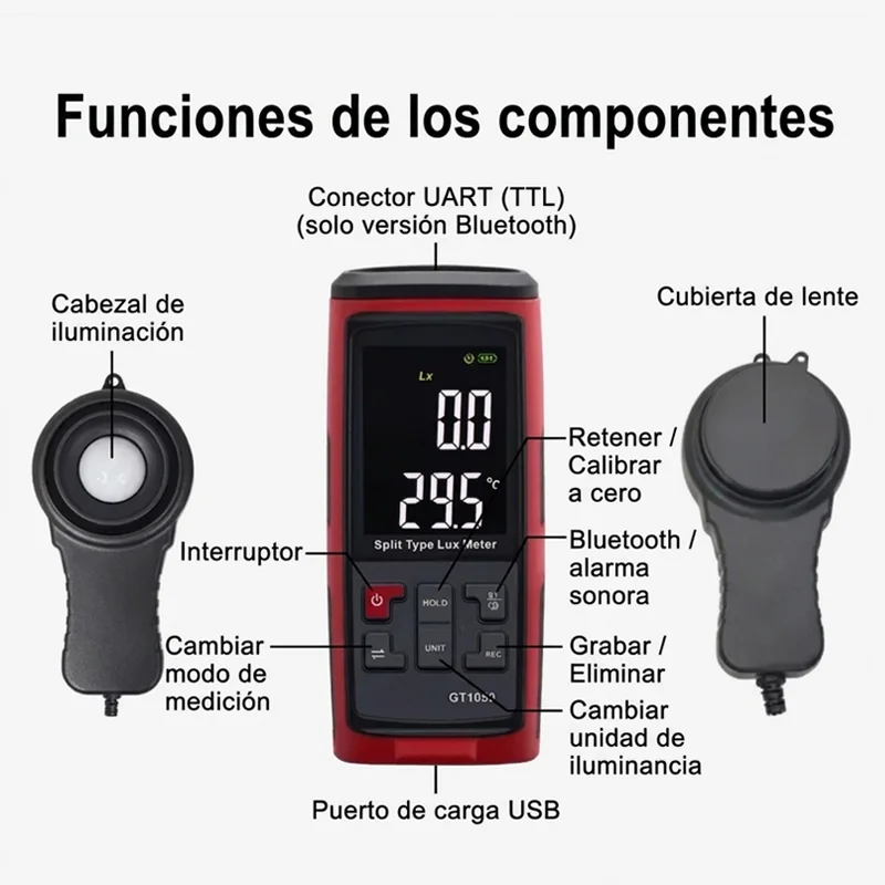 - Unidades de iluminancia (Lx/Fc) y unidades de temperatura (ºC/ºF) conmutables. Fc: candela pie; Lx: lux; relación de conversión: 1Fc = 10.764Lx